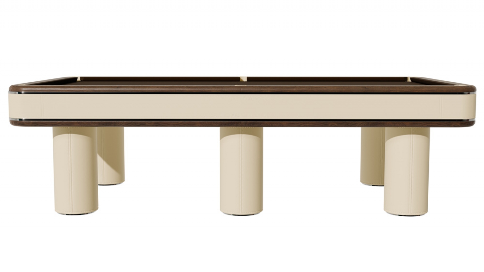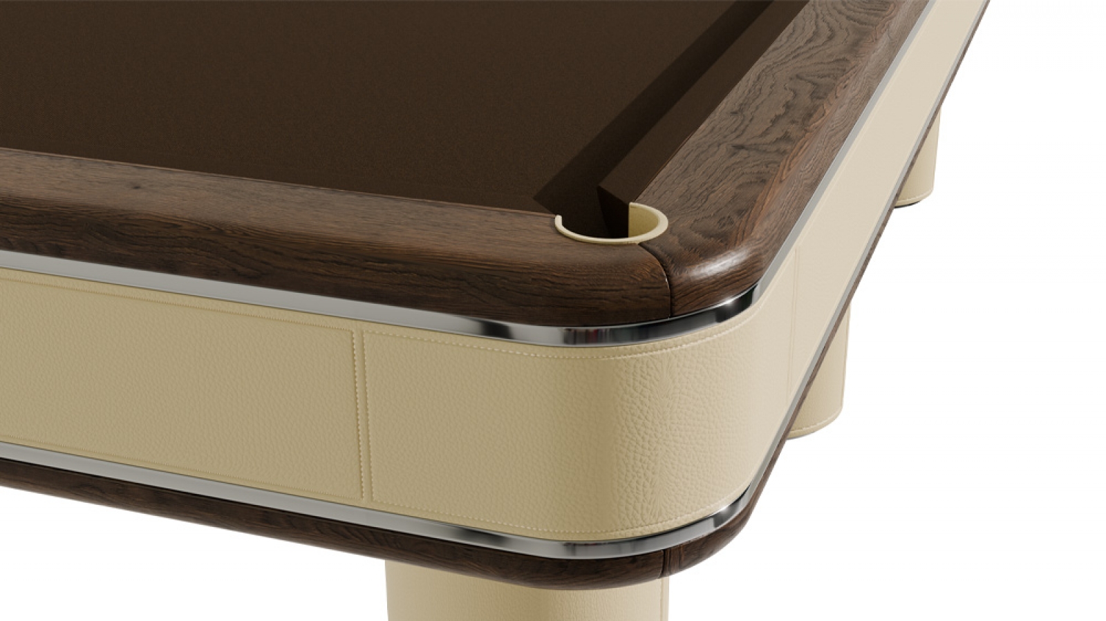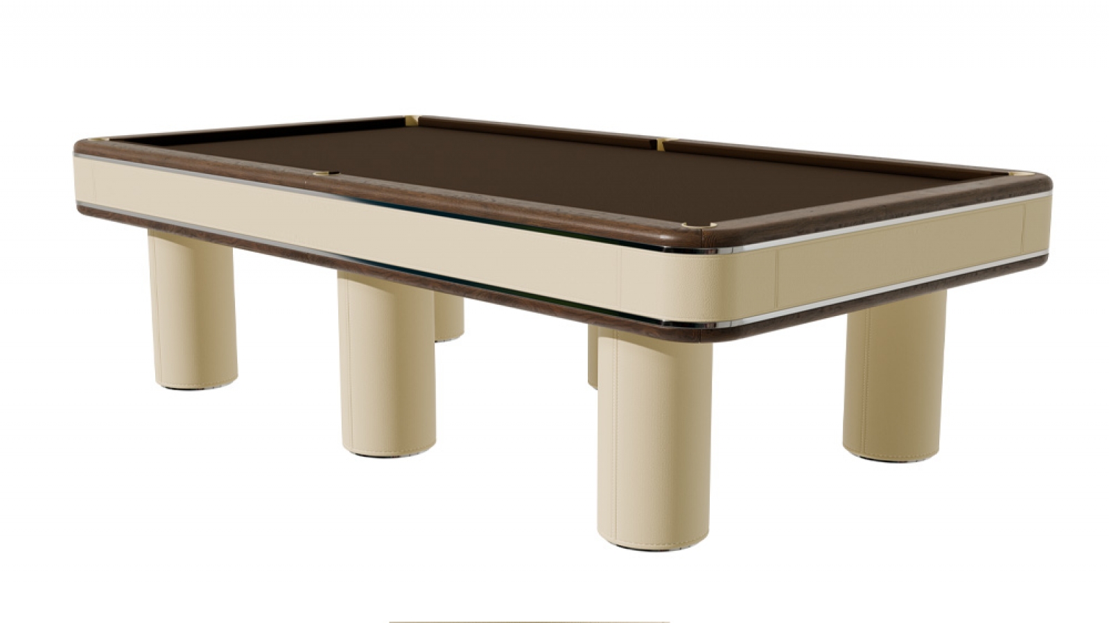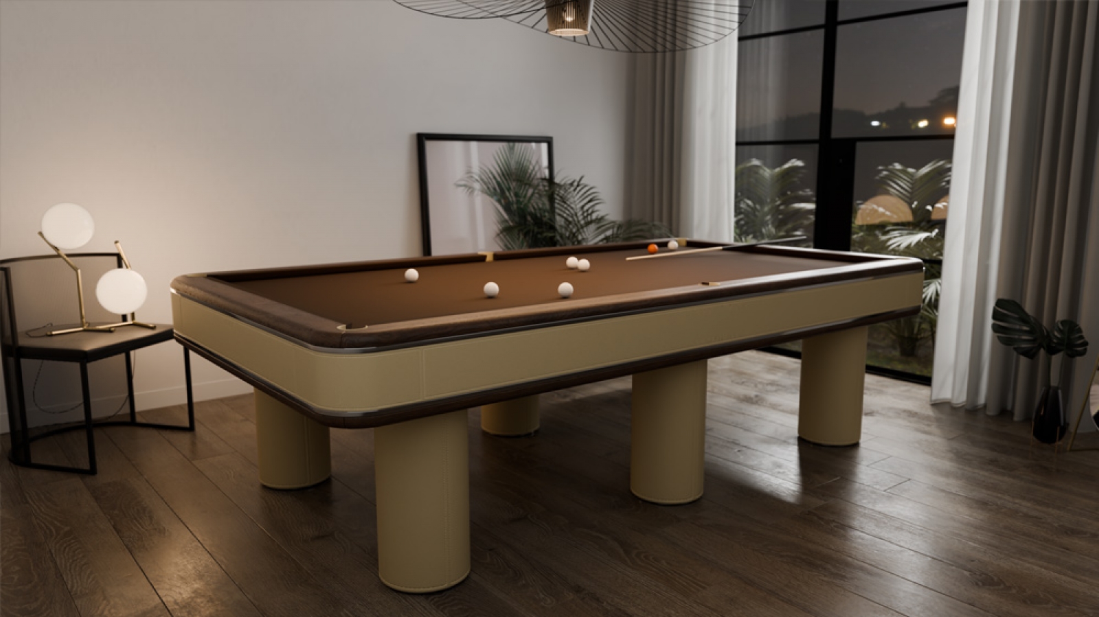 Бильярдный стол «Петрус» - использование железной рамы в данной модели и сочетание дерева металла кожи и Алькантары создает неповторимый рисунок и возможность цветового разнообразия.